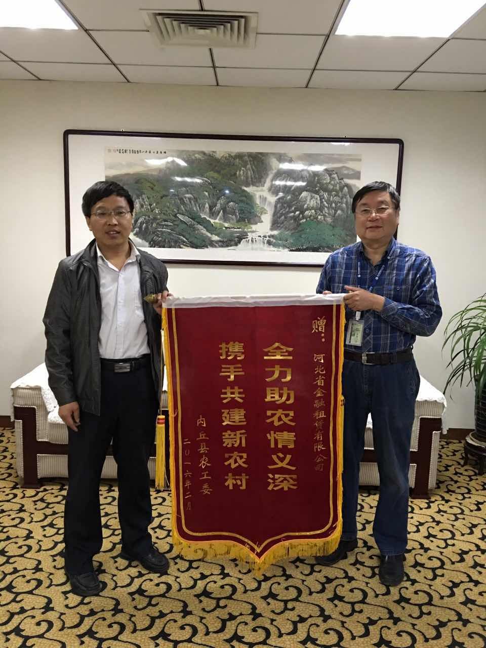 一年來,河北金租駐村工作隊與孫家坡村的干部群眾打成一片。在省市黨組織部門的抽查、突查中均未出現漏崗,中秋節、元旦等假日也堅守崗位,受到省國資委領導、各級扶貧辦和村民的一致好評。駐村工作隊榮獲內丘縣扶貧辦、農工委頒發的“2015年度扶貧工作先進集體”稱號,工作隊曹津生榮獲“2015年度扶貧工作先進個人”稱號。近日,內丘縣農工委特向公司贈送一面錦旗,表達了“全力助農情誼深,攜手共建新農村”的感謝之情。
