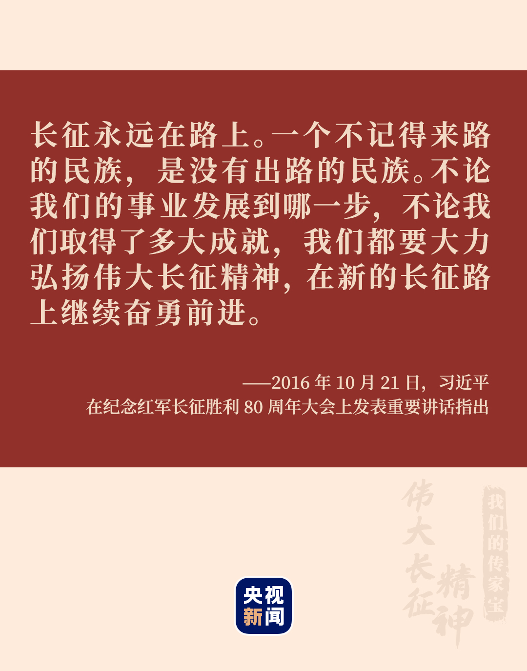 2016年10月,習(xí)近平總書記在紀(jì)念紅軍長征勝利80周年大會上指出,震撼世界、彪炳史冊的長征,宣告了國民黨反動派消滅中國共產(chǎn)黨和紅軍的圖謀徹底失敗,宣告了中國共產(chǎn)黨和紅軍肩負(fù)著民族希望勝利實現(xiàn)了北上抗日的戰(zhàn)略轉(zhuǎn)移,實現(xiàn)了中國共產(chǎn)黨和中國革命事業(yè)從挫折走向勝利的偉大轉(zhuǎn)折,開啟了中國共產(chǎn)黨為實現(xiàn)民族獨(dú)立、人民解放而斗爭的新的偉大進(jìn)軍。